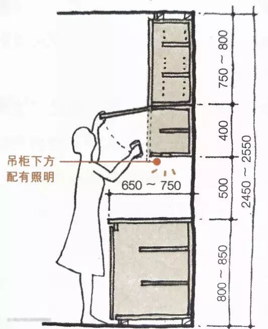 敲黑板,这里给出的高度是洗菜和切菜时所需的高度,而炒菜位置的高度则要比这再低5-8公分左右。