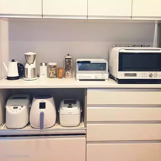 当然,如果是想收纳那些不经常使用的电器,搭配上平开的柜门即可,大件的电器收纳于此不知比收纳在吊柜里方便了几倍。