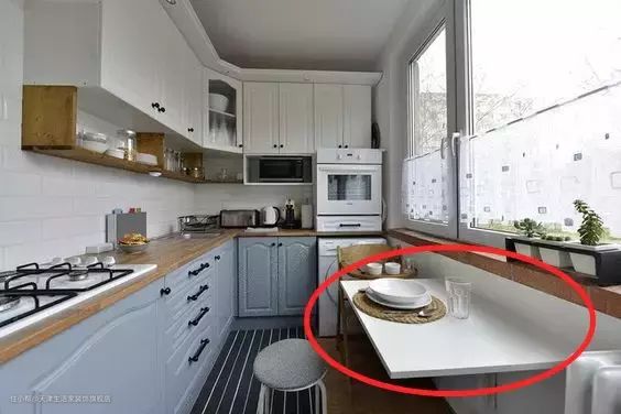 第二个适用于小厨房的收纳方式,则是可翻起的小桌板。