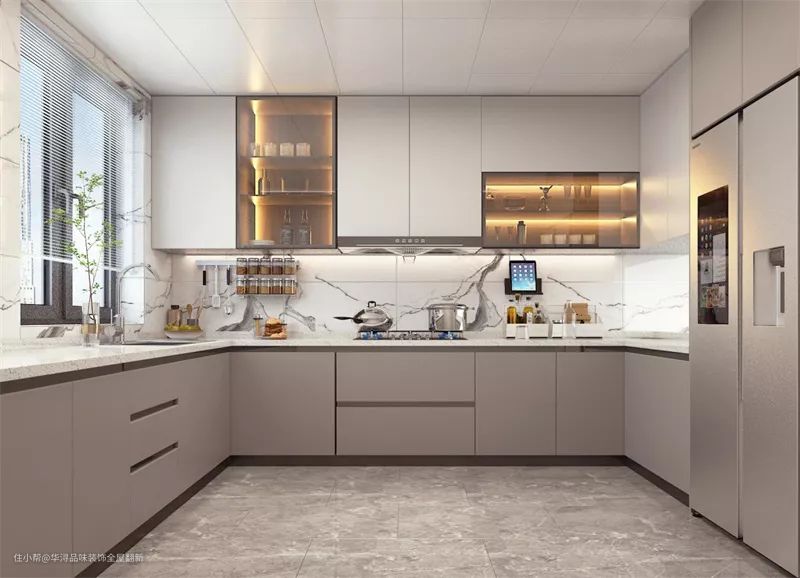 厨房最大的优点就是面积大,能够合理的布置出洗菜区、准备区、烹饪区和物品存放区,餐厅的主色调选用的是时下流行的浅灰色,冰箱的颜色是一样的,整体视觉上看上去更加一体化。