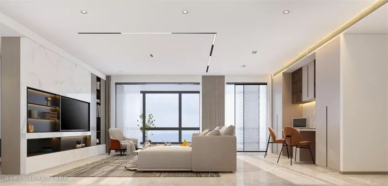 客厅采用了时下最流行的无主灯的设计,设计师还在此基础上创新设计了L型直角灯带,为整个客厅颜值提升不少。