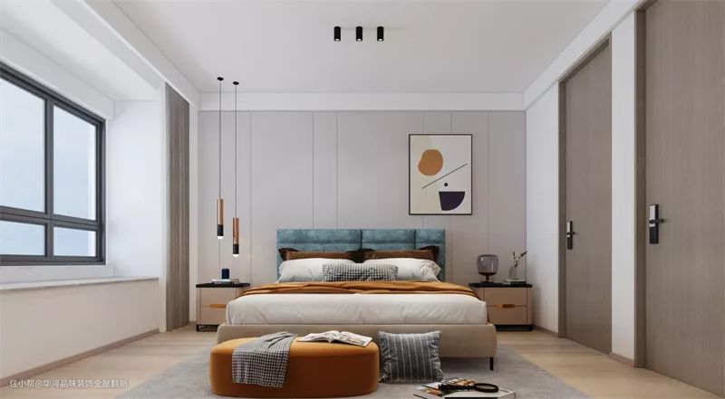 卧室选用的是木质地板,脚感更加柔和,床头反差选择的是青蓝色色调,冷暖色的交相呼应看上去更加饱满,垂线式的床头吊灯和右侧一副简约挂画犹如点睛之笔,打扮的卧室十分漂亮。