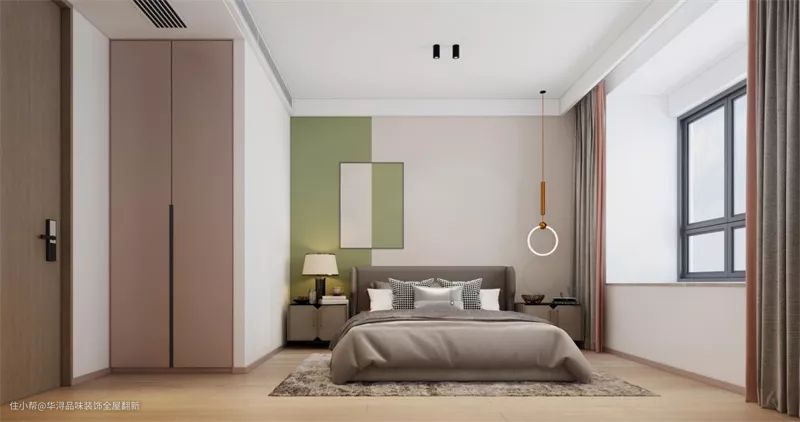 次卧和主卧的装饰风格大体一致,增加了房间统一性。床头背景墙采用了白色和淡绿色的拼接组合,加上圆形床头灯的设计,次卧的颜值也是高高在线。