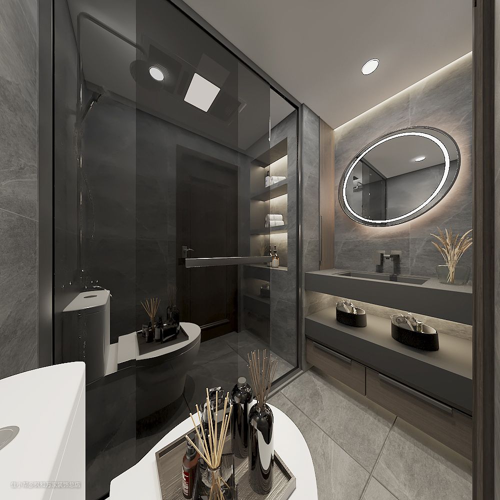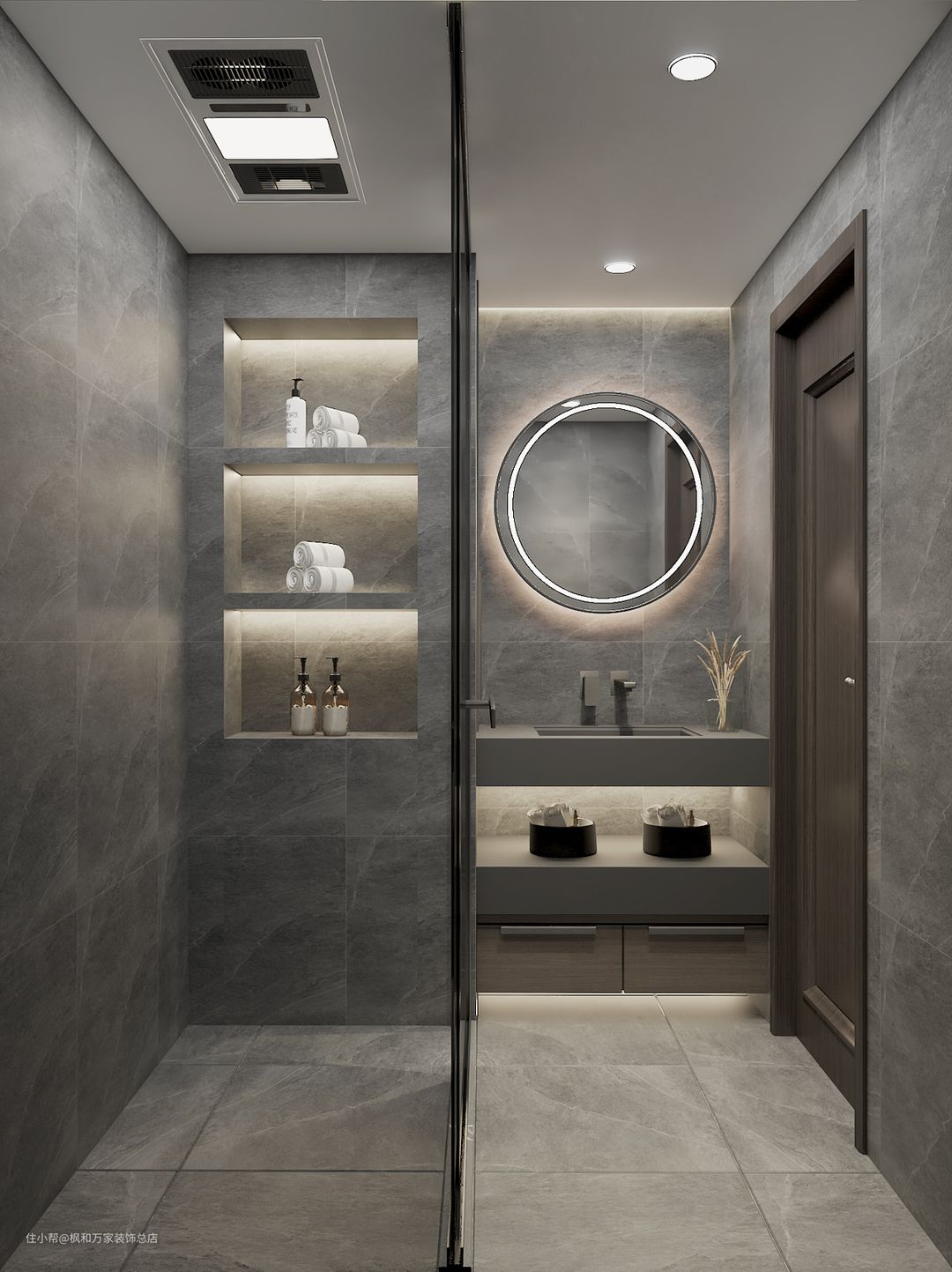 主卫以灰色为主,圆镜提升了空间的明亮度,灰色的台盆柜与灰色的墙面形成对比,层次分明,质感强烈。