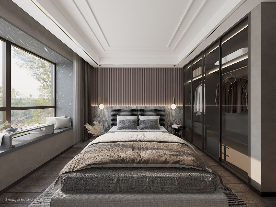主卧以静谧的灰色床品搭配藕色色的墙面,没有过于繁杂的装饰,慵懒舒适的氛围渐渐浓厚,彷佛隔绝了外界的纷繁嘈杂,可以放下心里的戒备,享受属于自己的一片安宁。