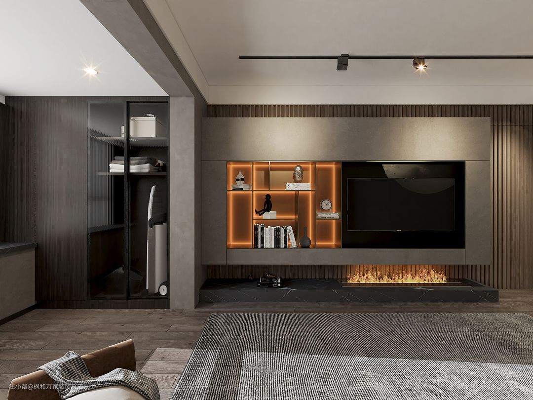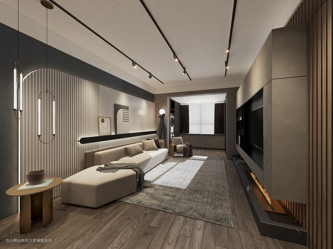 电视背景与沙发背景采用统一装饰格调,更具立体感,给人以简洁而个性的视觉观感