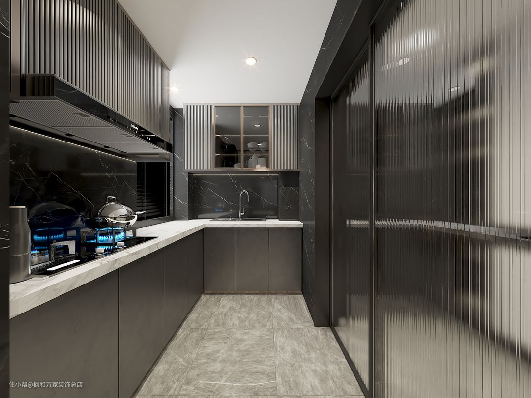 厨房,L型布局,纳入大型厨电,灰色橱柜搭配黑色墙砖,层次分明。