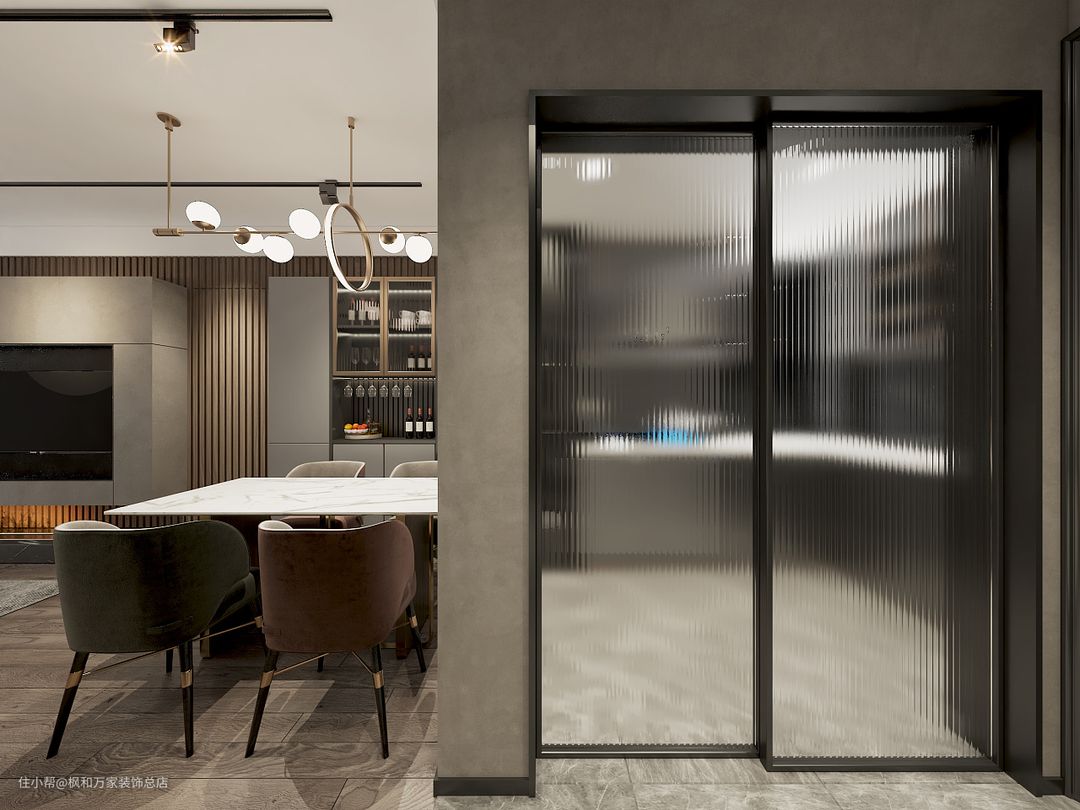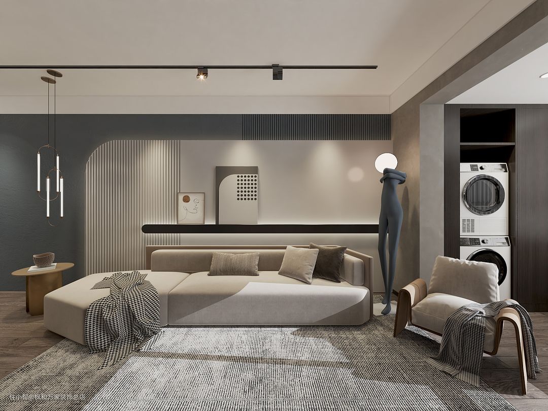 此案例为黑白灰简约风格,整体色调以灰色为主,白色黑色做局部用色,其中个别软装以,雾霾蓝,土黄为点缀,不显得过于清冷。