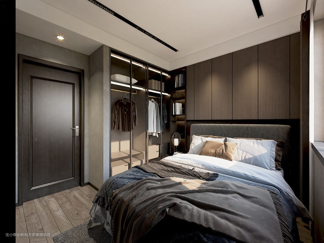 卧室的床头背景墙护墙板+衣柜一体设计,和床品也起到呼应的效果,床一侧分别用台灯辅助照明,灯具上加入金属元素更加优雅。