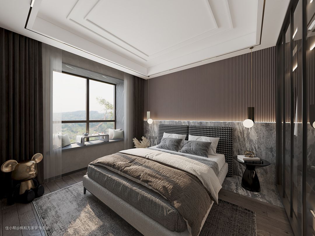 主卧,床头背景墙硬包设计,搭配千鸟格靠背+黑色床头柜,营造出宁静深邃的睡眠氛围。