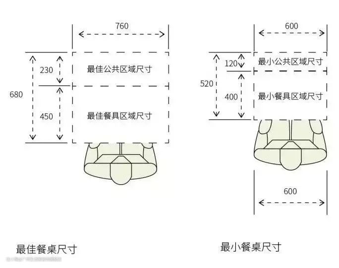 比较常用的有760mm * 760mm的方桌和1070mm * 760mm的长方形桌。桌高一般为710mm,适合配415mm高度的坐椅。餐桌的宽度不能小于700mm,否则家人对坐时很容易因餐桌过窄而产生脚碰脚的情况。