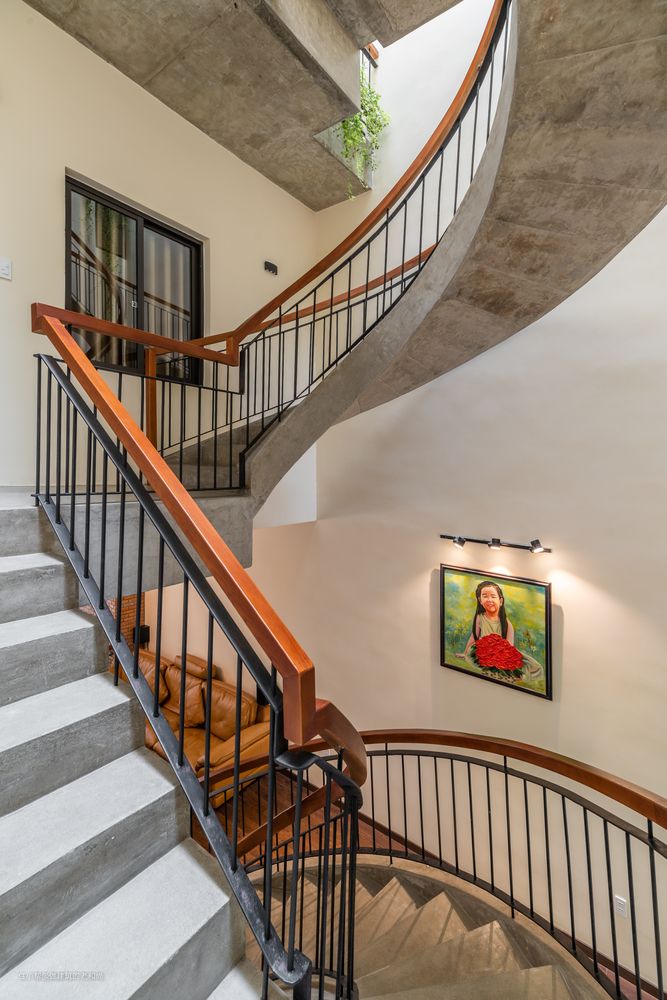 城市住宅的用地紧张不论是对于公共建筑还是私人住宅建筑,都让使用者在满足使用需求的前提下纵向往上延伸,而对于狭长型的地块,往上延展的结果让内部空间的采光成为主要矛盾。更为准确地说,应该是建筑中间位置的采光问题,即便在城市中的住宅,往往面临左右两侧均是紧挨的建筑,它还是拥有前后两侧可以获取充足的阳光。而狭长型地块中的大进深,让它的中间位置会形成暗房间。如何解决这个问题呢?相对低矮的一两层体量的建筑,在中间置入一个中间庭院便可解决这一问题,而对于城市住宅为了满足功能需求往上延伸的现状,仅仅置入一个中间庭院,或许只能有限的从这个管道获得一点点的采光,如何让它的采光性能最大化才是问题的关键。今天小编就要给大家介绍一个越南的城市住宅,看它是如何巧妙地利用漏斗式的采光井解决这一问题,拥有一个舒适惬意的家居空间的。