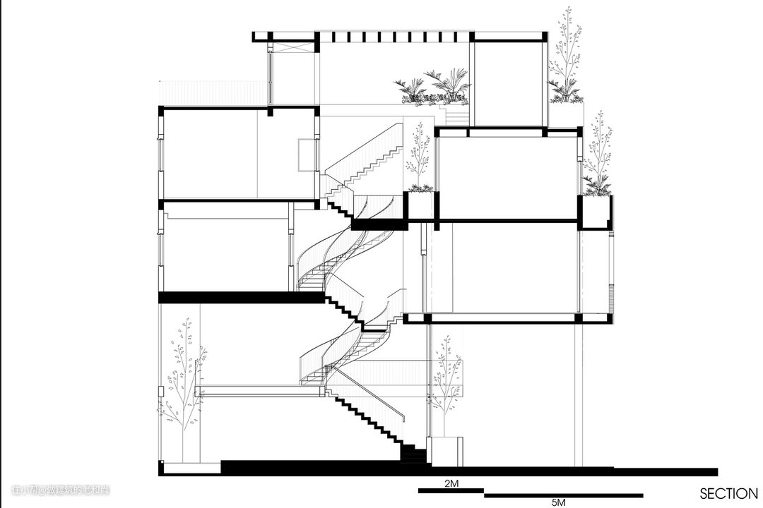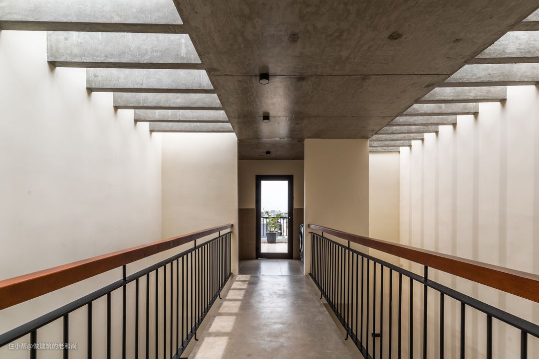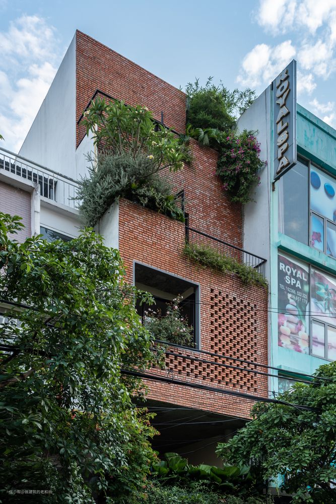 该项目位于越南的城市地段上,典型的基地特征|:场地狭长,仅有一侧与城市道路相邻,两侧被邻居住宅紧紧挨着。这样的地块,确定了其建筑主入口的位置,自然地处在了临街一侧,与城市空间的交互,让人不得不注重临街一侧立面的打造,该建筑以一个醒目的红砖立面示人,并在立面上配置了诸多绿色植物,红配绿在这里并未让人产生不好的视觉观感,反而是粗糙的红砖将绿色植物景观凸显了出来。作为城市界面而存在的绿植,与城市空间发生了很友好的互动。