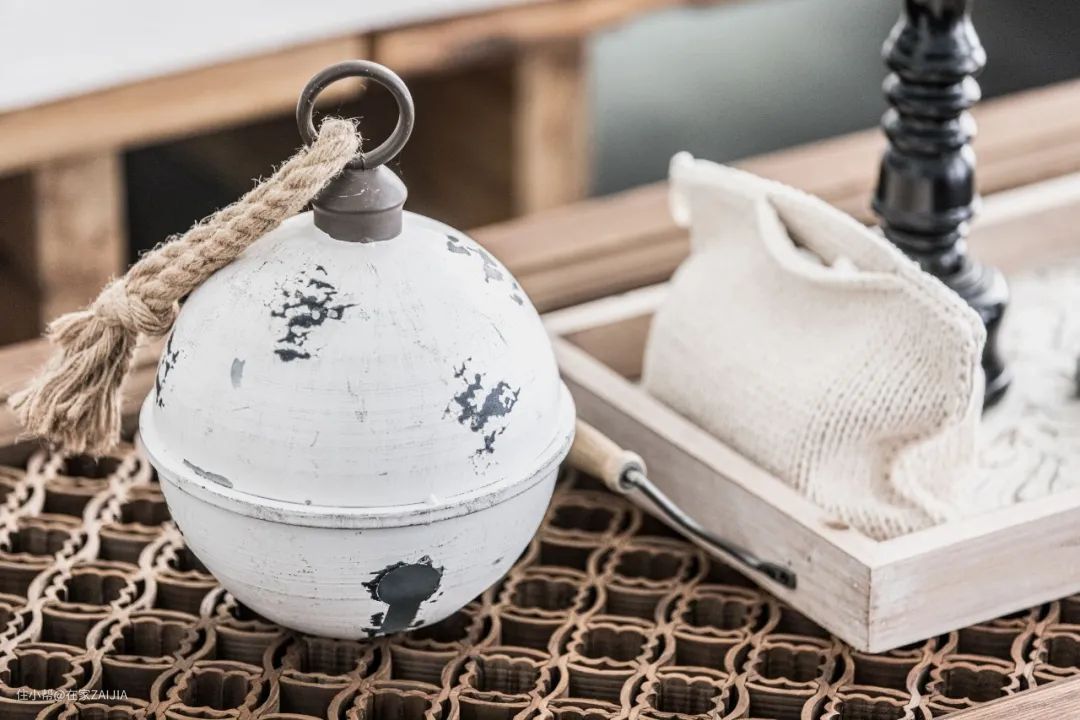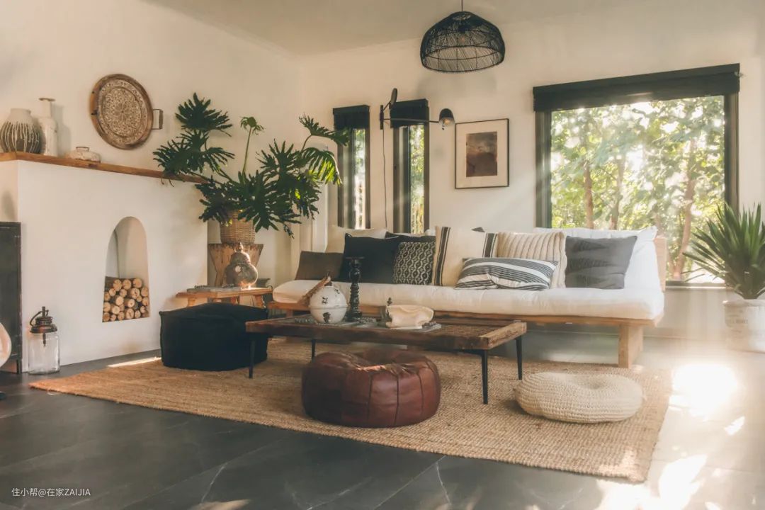 茶几是一块老窗扇,根据花纹判断,有可能是清末的。壁炉上面摆着的是平时收集的花瓶,都是纹理偏粗糙自然的,和整体风格比较搭配。