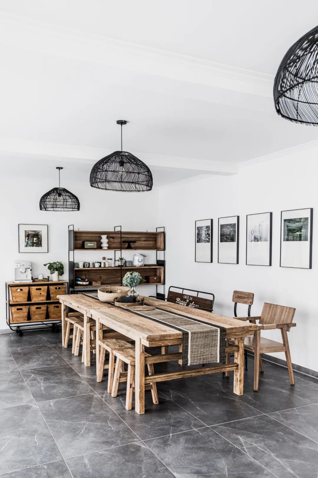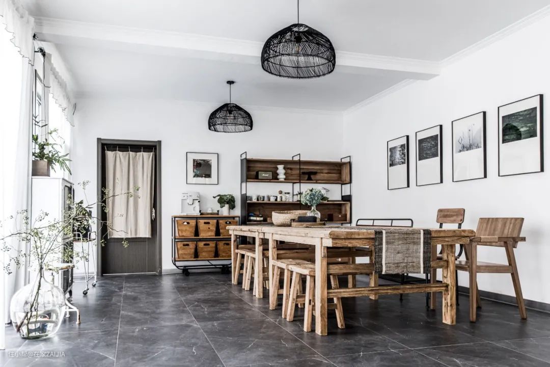 餐厅的老榆木桌子可以拆成两组,也可以拼接,拼接后有4.6米长,能坐18人左右,完全可以满足聚会的需求。墙上所有的挂画都是我们自己的作品,摄影作品出自我,绘画作品出自孩子爸爸。