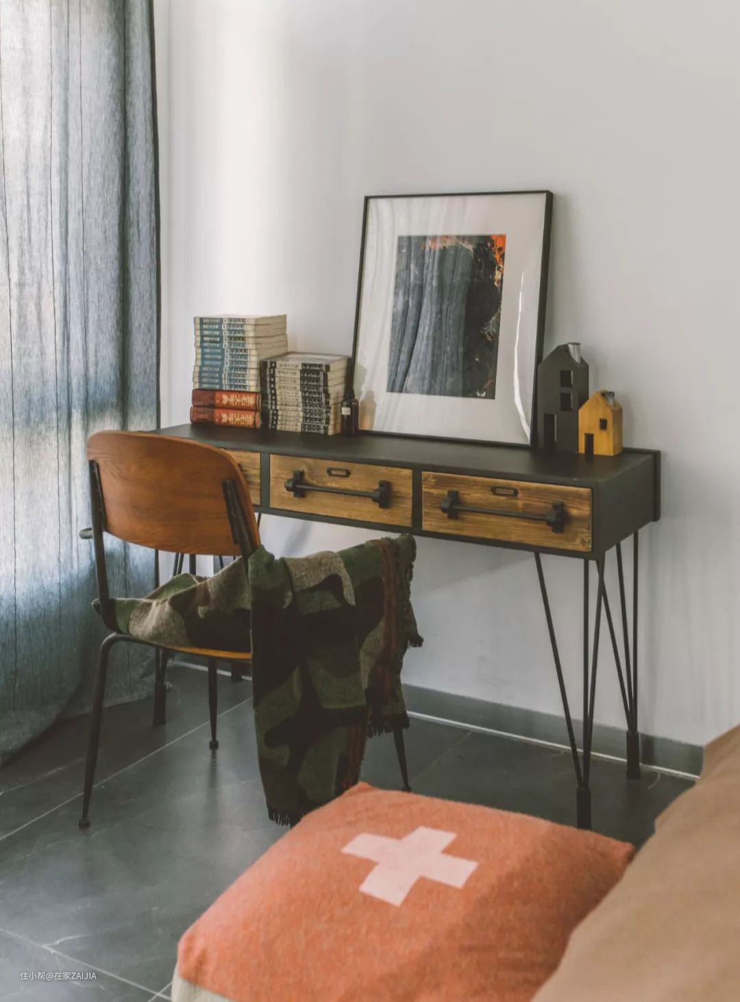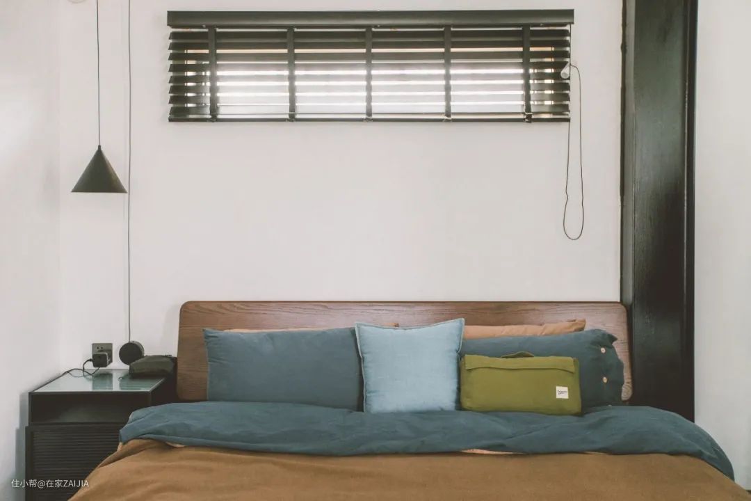 另外一间卧室非常好眠,灯具、书桌和床品都以深色为主,关上百叶窗、拉上窗帘就进入了适合睡眠的昏暗环境,在这里入睡很快也不再失眠了。