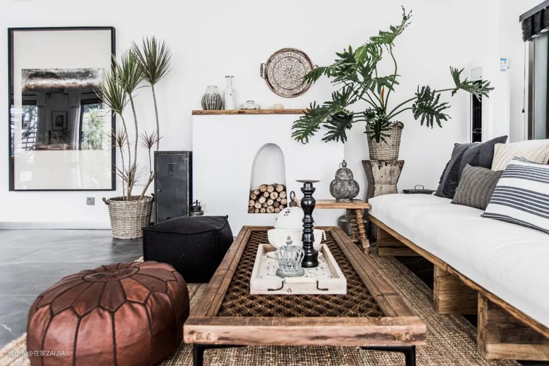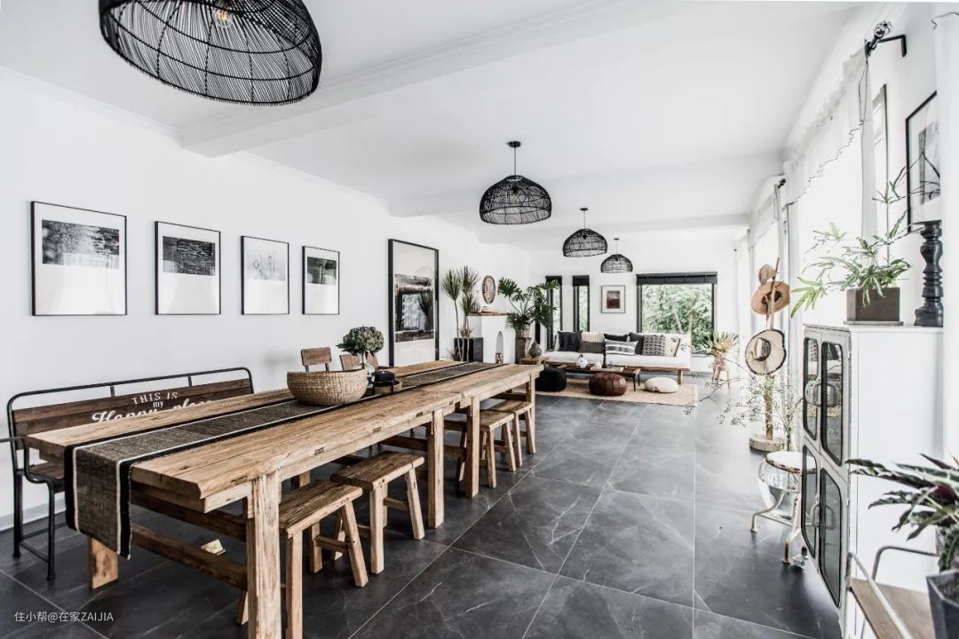 客餐厅的餐桌、沙发、木凳都是用老榆木定制的,比较有年代感,而且老榆木用的越久木头本身的质感会越好。