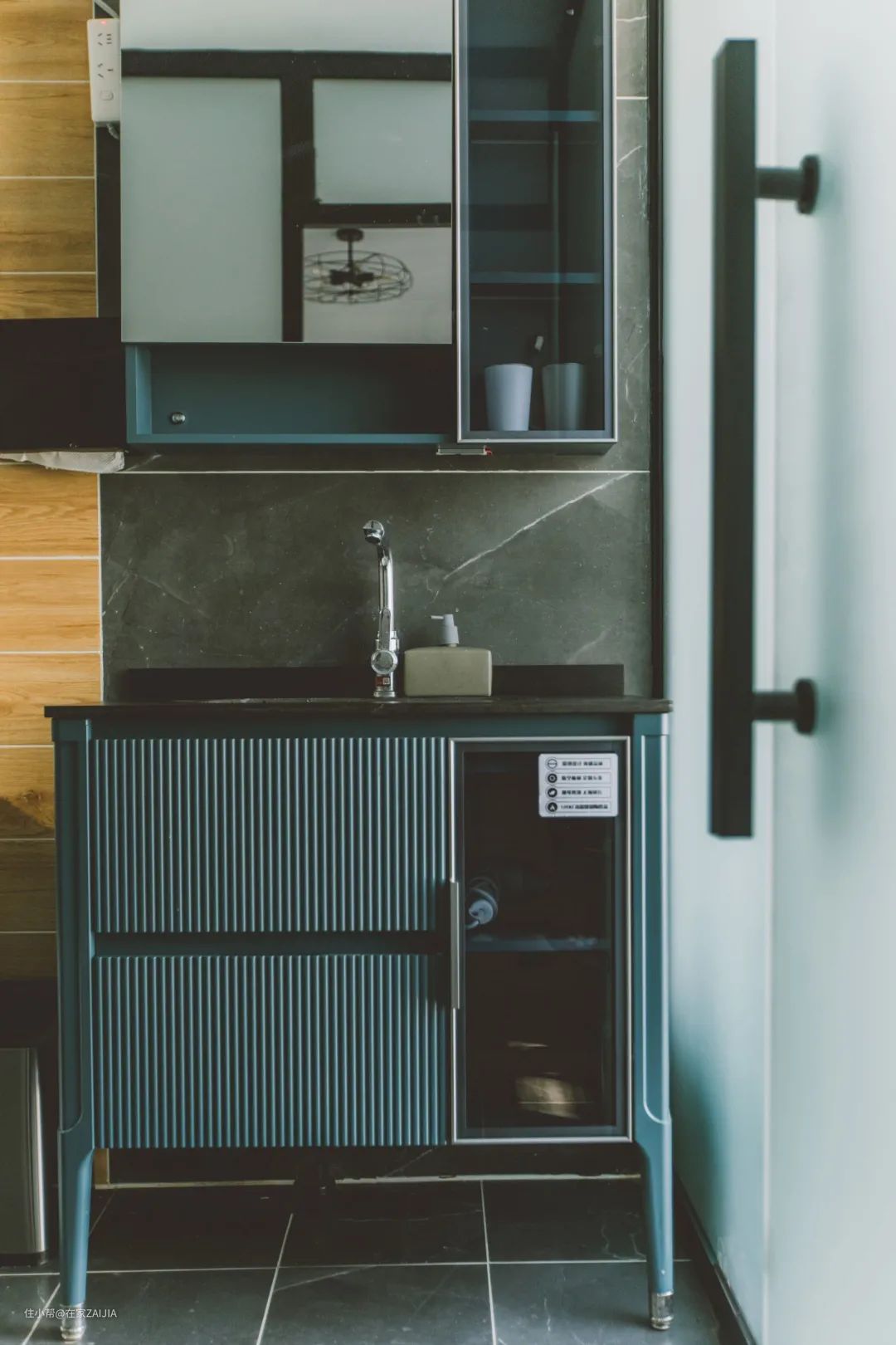 卧室里的卫浴间,柜体和五金同样选的黑色,保持了整体性。镜柜做了很实用的半开放式,不常用的护肤品藏在镜子后,常用的洗漱用品、护肤品放在透明柜门之后,开放格则可以放置肥皂等随手使用的物品。