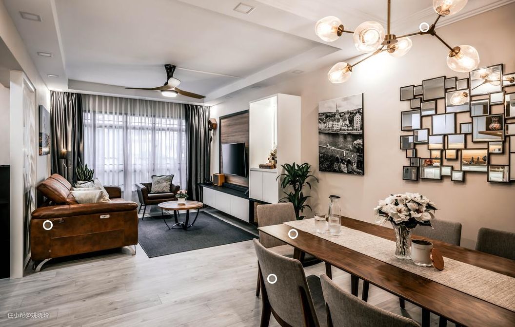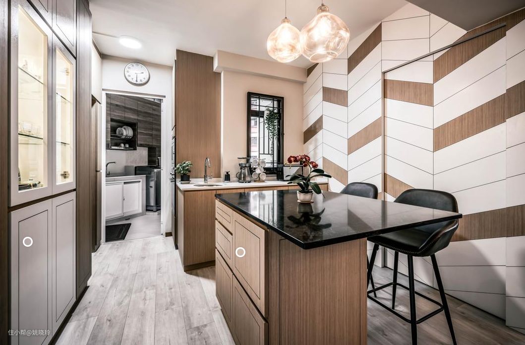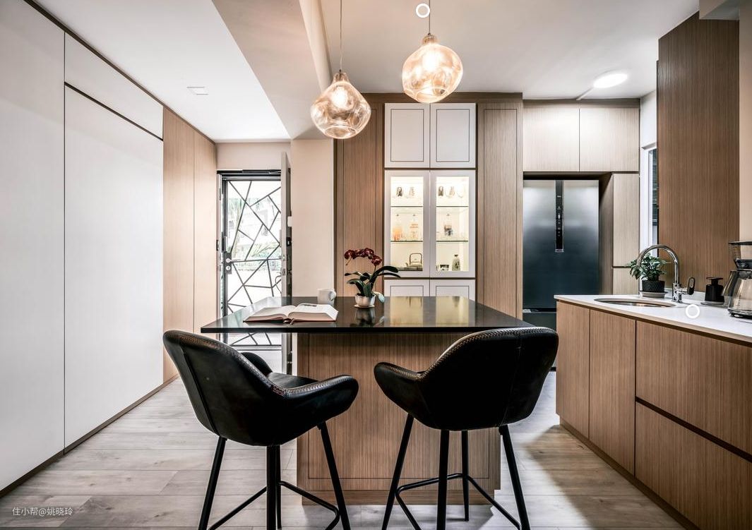 房屋以深色为主题基调,配合大量的原木家具及铁艺配件,搭配一些极具工业风特色的金属灯具,打造出一个精致而独特的工业风住宅。