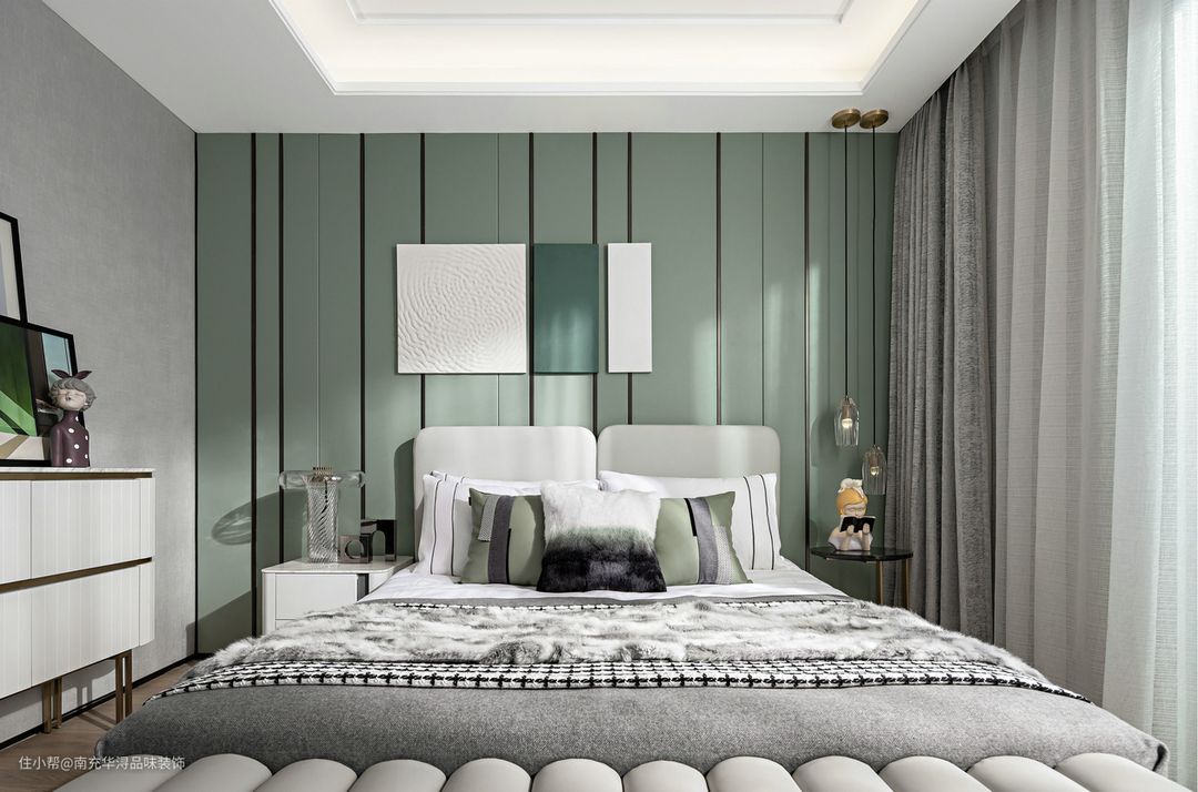 近几年兴起用不同的颜色当做背景墙色,五彩缤纷的色彩让空间富有层次,更加鲜明,也更能用色彩表达出屋主内心的情感。本案使用的是绿色加上灰色的色彩搭配,我们常将绿色比作大自然,是带来生机气息的颜色,在绿色的空间里可以感受到热烈的活力存在。
