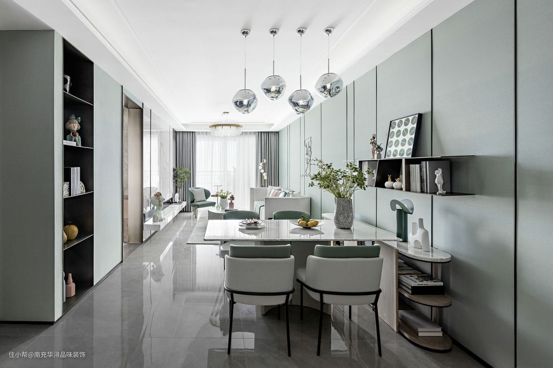 绿色的墙面与灰色的通铺瓷砖延伸至餐厅,没有变化的色调却因为延伸的长度变换打造出层次鲜明的视觉感。在中性色中融入自然的绿植,打破单调的色彩,赋予了整个空间生机与趣味。