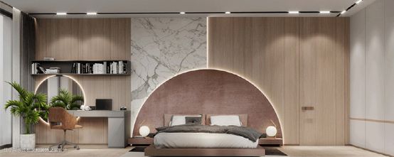 如果横梁突兀地出现在床头上方,容易给居住者造成比较大的精神压力,造成睡眠不足、头痛等情况。如果实在无法避免横梁的话,可以在设计上弱化横梁的存在感,减少它的压迫感。