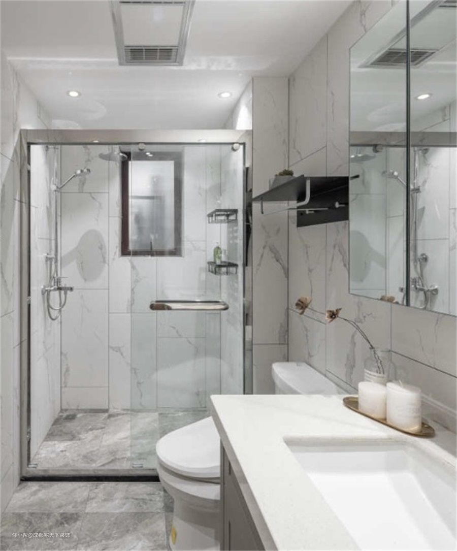 白色大理石的卫生间,质感十足。淋浴间采用了玻璃隔断,卫生间整洁又干净。