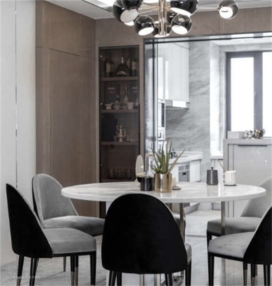 高级灰与高级黑的搭配,显得魅力十足,两者相互呼应,再搭配上白色的大理石餐桌,简约中带着时尚,质感满满,富有层次感。还放置了餐边柜,充分满足了餐厅的收纳空间。