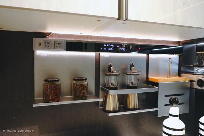 厨房灯光也是不可忽视的一部分,尤其是洗菜和切菜的地方,只有一盏吸顶灯肯定不够用,如果不想“摸瞎”做饭或者找东西,灯光就要记得安排够了。可以在吊柜底部装上灯带,也可以采用类似这样的智能灯光系统,兼具收纳、照明、充电功能,使得工作起来更加轻松和便捷。