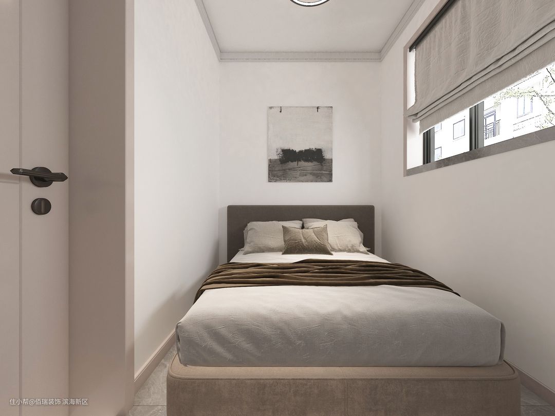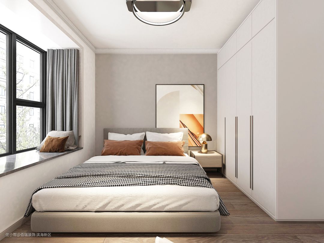 主卧空间不大,但是十分有个性,大飘窗让主卧显得更加亮堂,色彩上用了一些简洁的颜色白色,灰色。