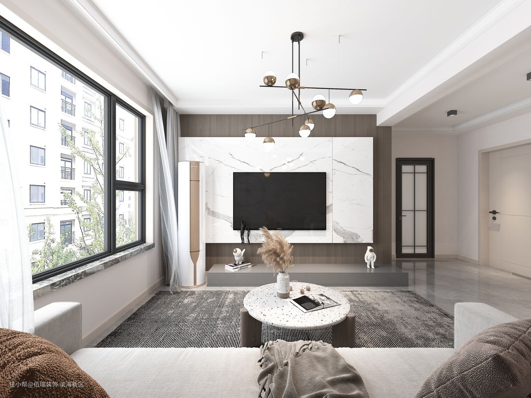 客厅电视墙做的大气、温润,大面积的采用爵士白大理石,质感很好,看上去也很简洁,客厅采光也很好一个大窗户。