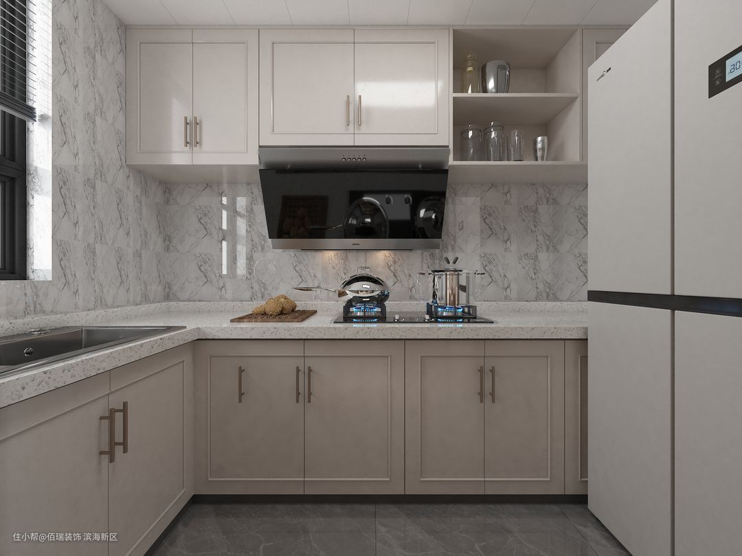 厨房空间比较大,地面全部贴深褐色的镜面砖,在显精致的前提下还有高级感。橱柜柜门用得很有档次的奶咖色。因为空间比较大冰箱双开门,一点都不会影响到厨房的使用面积。