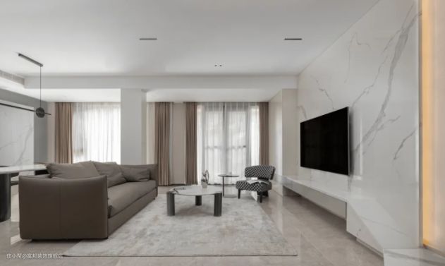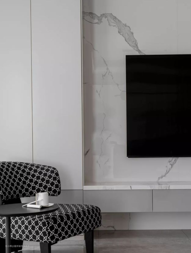 悬空设计结合灯带,大理石电视背景墙嵌入电视机,时尚又高级。聚聚子就很喜欢这种,氛围感直接拉满!