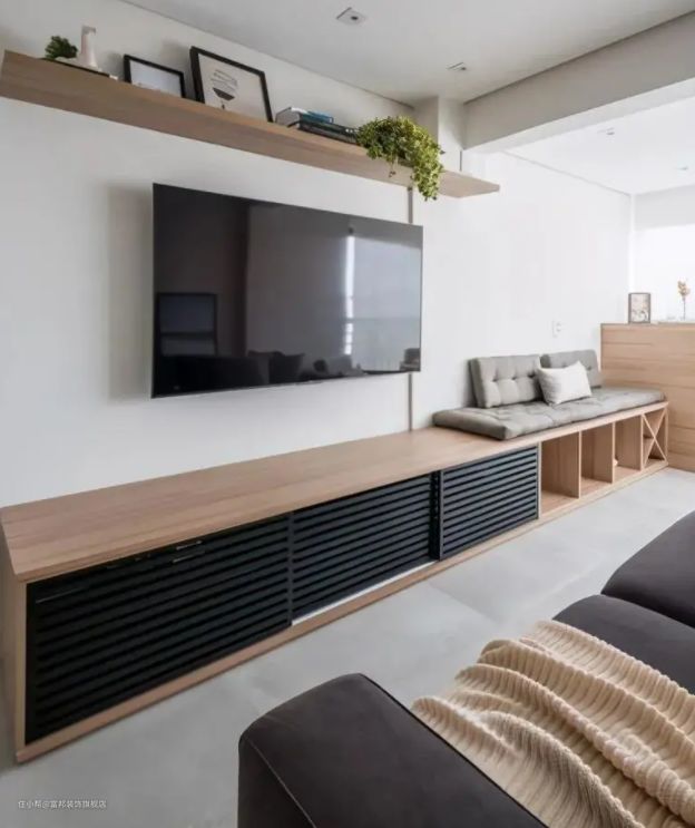 电视墙一侧做立柜,结合一字型悬空的电视柜,满足客厅的储物需求,想要尝试悬空设计,又想多收纳的朋友,参考一下~