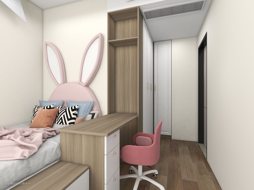 女孩房入户正对衣柜,选用了白色不突兀也不会很压抑,床头单独做了软包造型。