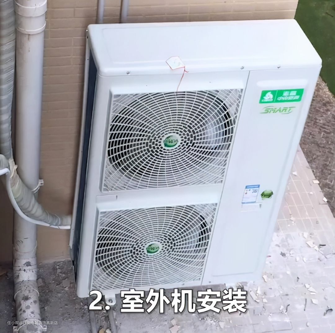 室外机的安装要注意其出风口50公分之内不能存在任何遮挡,室外机下面还必须安装减震物,用来保证外机的正常运转。