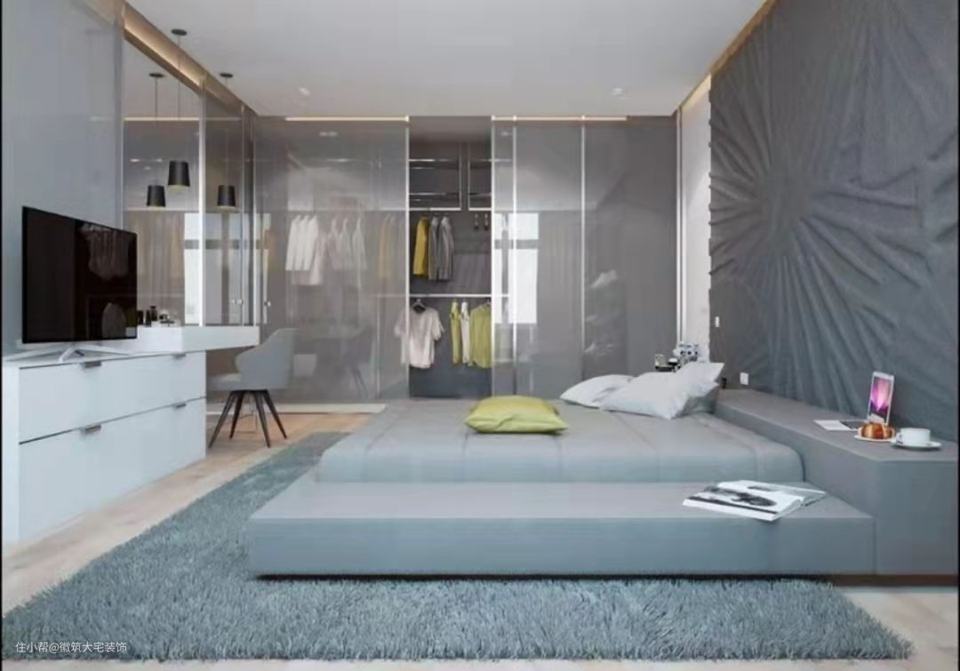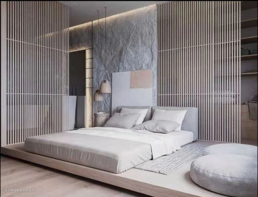 除满足睡觉这一功能外,地台在设计之处也承载着装饰的作用,地台床可以适应多种设计风格,颜色将会由设计师根据房屋整体风格定制不同的尺寸大小及花色,降低空间中心,横向增加视野的开阔感,使卧室看起来更宽广,更具整体性,从而营造出一种慵懒的氛围感。