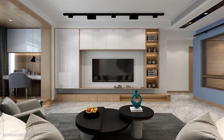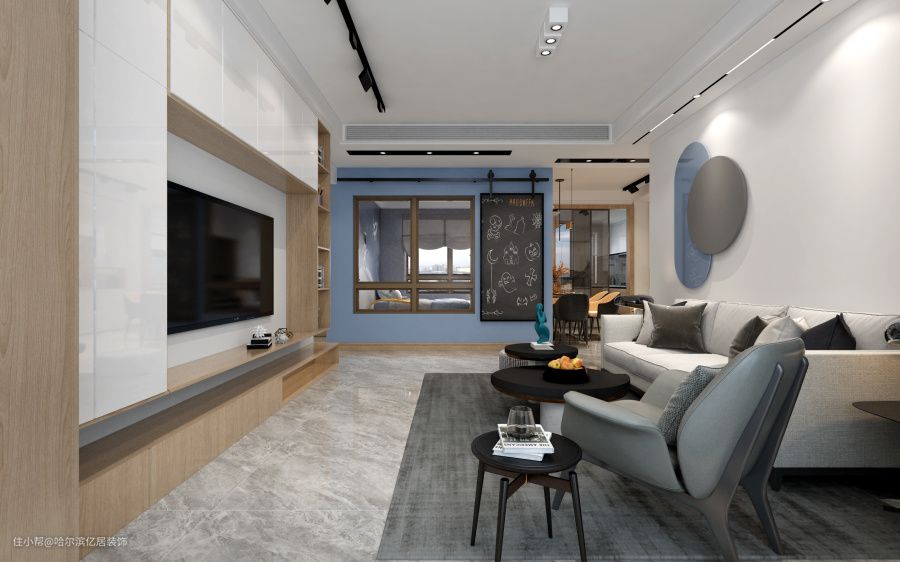宅进温柔简约的家 哈尔滨恒大珺庭现代风装修哈尔滨亿居装饰2021-11-25白色与灰色作为空间主色调,营造安静,温柔的空间氛围,大胆运用了清新的水蓝色,作为突出,使空间有层次。— 客厅 —— 餐桌 —— 厨房 —— 阳台 —— 主卧 —— 主卧卫生间 —— 次卧 —— 儿童房 —— 卫生间 —