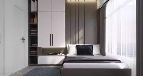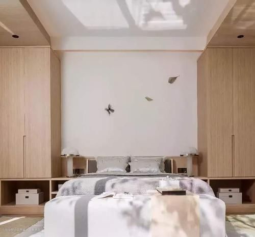 整个床头背景墙做了柜子的更应该留出一部分空间,缓解卧室床头背景墙做满墙柜子所带来的压抑感。