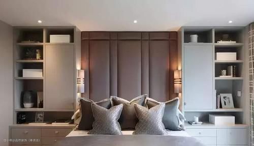 把床头背景墙上方的空间都做上了吊柜,然后枕头上方一点的位置留空一排架使用,看起来非常大气。