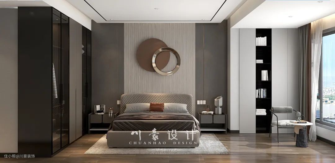 主卧设计以沉稳舒适为主,整墙式玻璃收纳柜,满足平时衣物收纳需求。搭配上灰色的布艺床,还有灰色窗帘与软装,再加上独特的造型装饰物布置,让空间显得更加舒适、优雅。