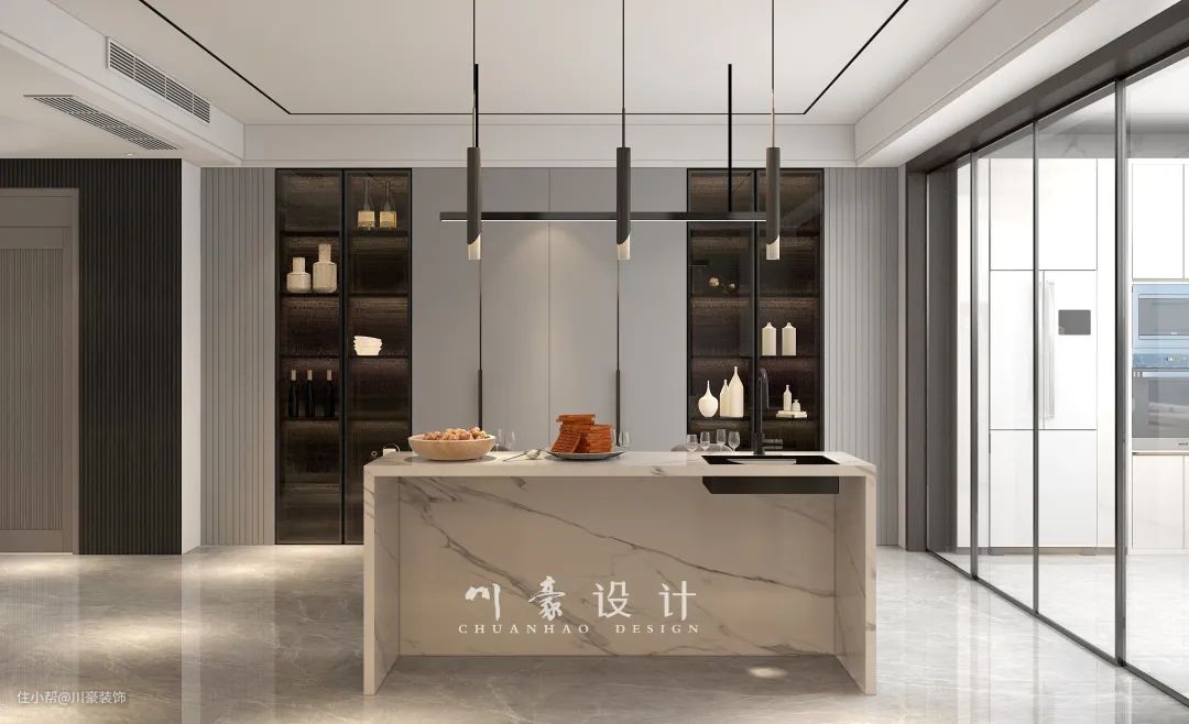 餐厅大理石餐桌搭配橙色餐椅,桌上摆放精致的餐具,优雅的用餐氛围就这样轻松营造出来。岛台的设计平时可以用来做熟食,后方设置整墙式的酒柜,用来收纳酒具和放置装饰物,一物两用,实用性满满。
