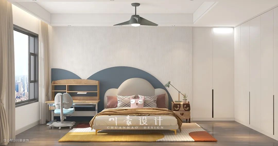 次卧是儿童房,整体设计以可爱舒适为主。白色木饰面搭配蓝色造型床头背景墙,清新又好看。奶灰色儿童床,以可爱的粉色抱枕和彩色地毯作点缀,色彩丰富却不杂乱。L型整墙式白色收纳柜,与墙面融为一体,显得干净又整洁。