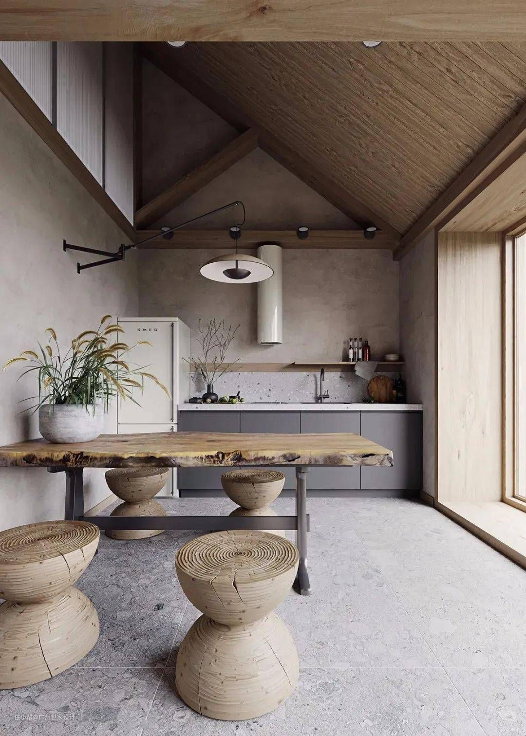 因为材料都尽可能保持原本的形态和质地,材料也保持着原本的颜色。侘寂风的家居大多都保持自然特有的水泥灰、原木色、亚麻色、石青色、砂砾色……这都是材质本身的颜色,而不是以一种颜色去形容,原色就是最自然的。