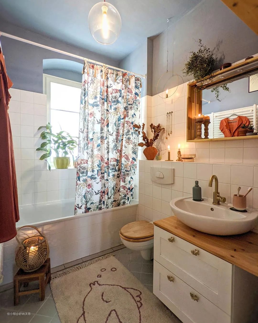 卫生间的蓝白配色乍一看是地中海风格,但从细节中能看出对复古丛林风的延续,不管是窗台和浴缸旁的绿植盆栽,还是植物花卉图案的浴帘,都在细节上刻画整体。
