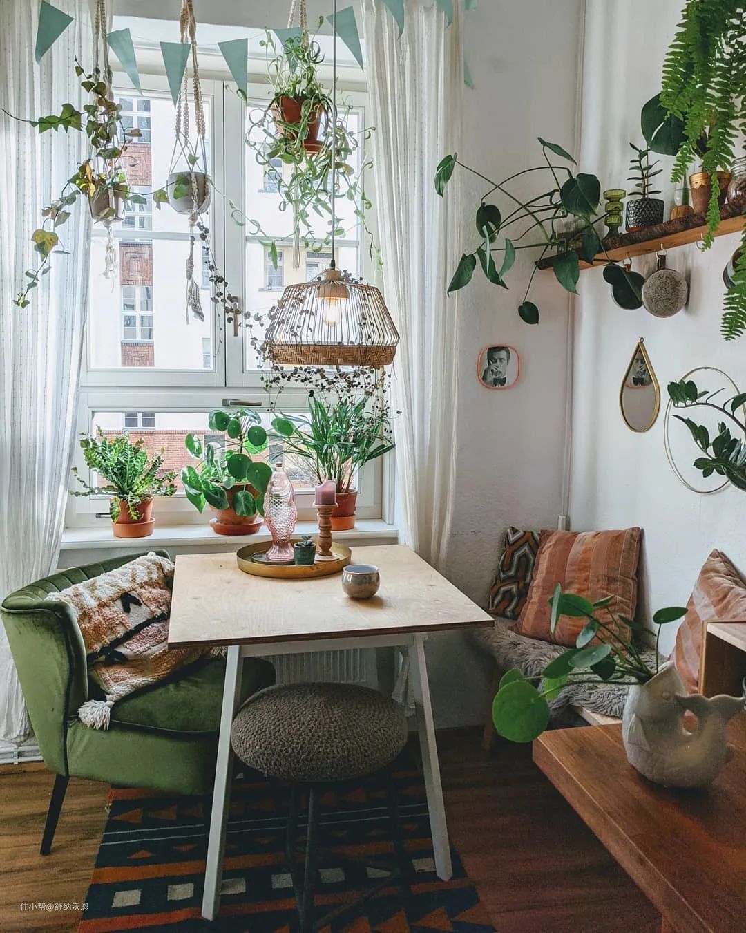 厨房内的就餐区仿佛高级餐厅一样,布置得精致又复古。小餐桌靠窗摆放,窗台摆放绿植和吊篮盆栽,阳光照耀生机满满,心情也随之变得愉悦起来。