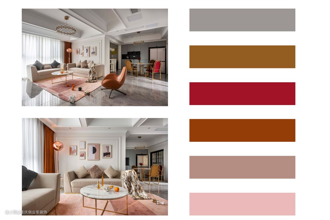 在这套案例中,我们用到了珊瑚橙、豆沙粉等INS风的暖色。相比红、黄等经典暖色,粉色不仅让人感到温暖,还能让房屋自带精致温柔的视觉效果。