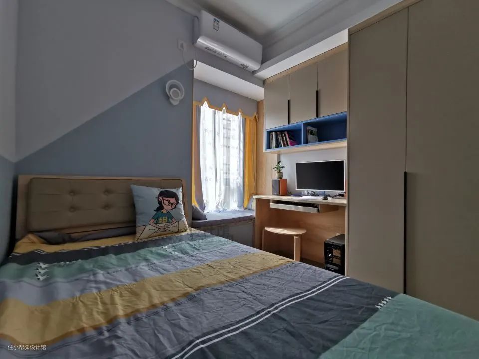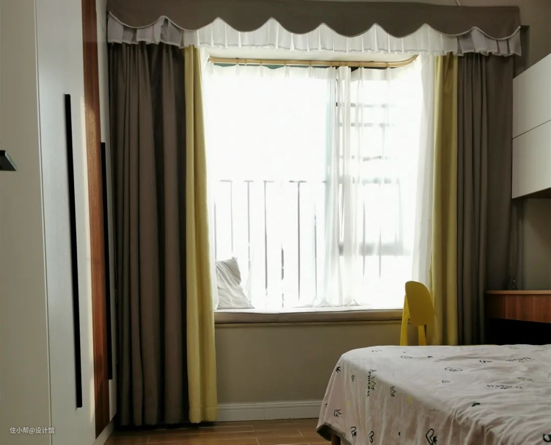 ▲飘窗上方装一层顶,做成窗帘盒的功能,让窗帘导轨与缝隙都藏起来。