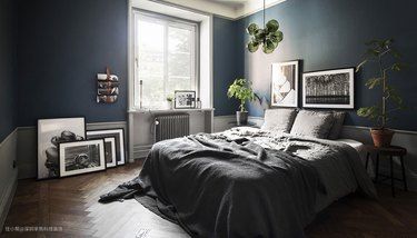 灰色色调通常展示蓝色底色,使蓝色色调非常匹配。因此,跟随斯堪的纳维亚之家的这种喜怒无常的设置,用大胆的海军蓝装扮你的银色卧室墙壁。以灯光、装饰和植物的形式,用青翠的绿色打破充满戏剧性的配色方案。