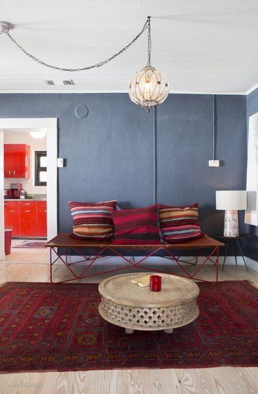 您可能没有意识到,但根据您选择的特定色调,红色和灰色的组合可以产生多种情绪。一个主要的红色与冷灰色可以感受到非常活泼,精力充沛,而深灰色和深绯红会感觉完全不同。在这个波西米亚风格的客厅里,石灰粉刷的石板色墙壁搭配红色沙发床、配套枕头和红色图案地毯。整体外观令人陶醉,给人留下持久的印象。